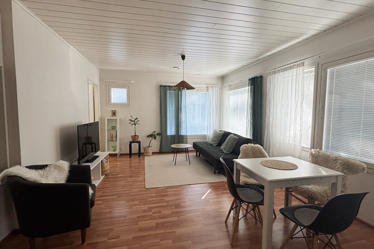 Novi stan na 4. spratu na najboljoj lokaciji u Rovaniemiju. Stan se nalazi pored usluga. Stan od 44 kvadratnih metara je moderan, kao i svetao zahvaljujući velikim prozorima. Kuhinja ima glavni pribor za kuvanje. Posteljina i peškiri su uvek uključeni u najam. U dvorištu je parking na rolni. Parking se može rezervisati u sopstvenoj garaži u kući za 10 e/dan. Molimo vas da se tokom boravka dobro brinete o stanu. Srdačno ste dobrodošli!