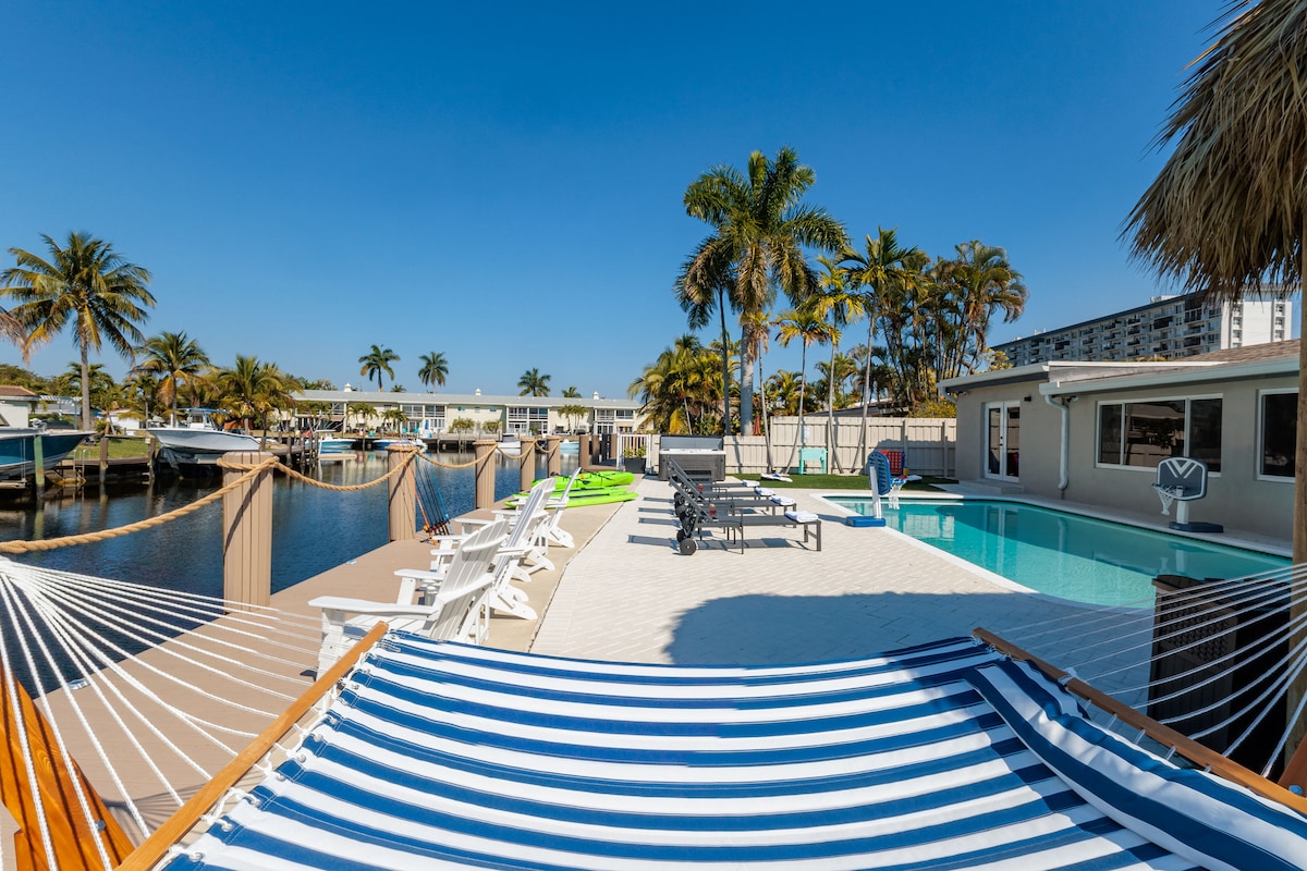 Enjoy the sun in this private waterfront home oasis with large heated pool & dock with fishing poles, fenced in backyard surrounded by tropical plants & barbecue with canopy dinning. Located on a quiet street 1 mile away from new Hard Rock casino, newly remodeled home has every upgrade! with Italian villa flooring & new stainless appliances & fully stocked cooking extras. 3 bedrooms & 2 full bath. All the beach amenities with cooler, beach towels & more for the perfect vacay!