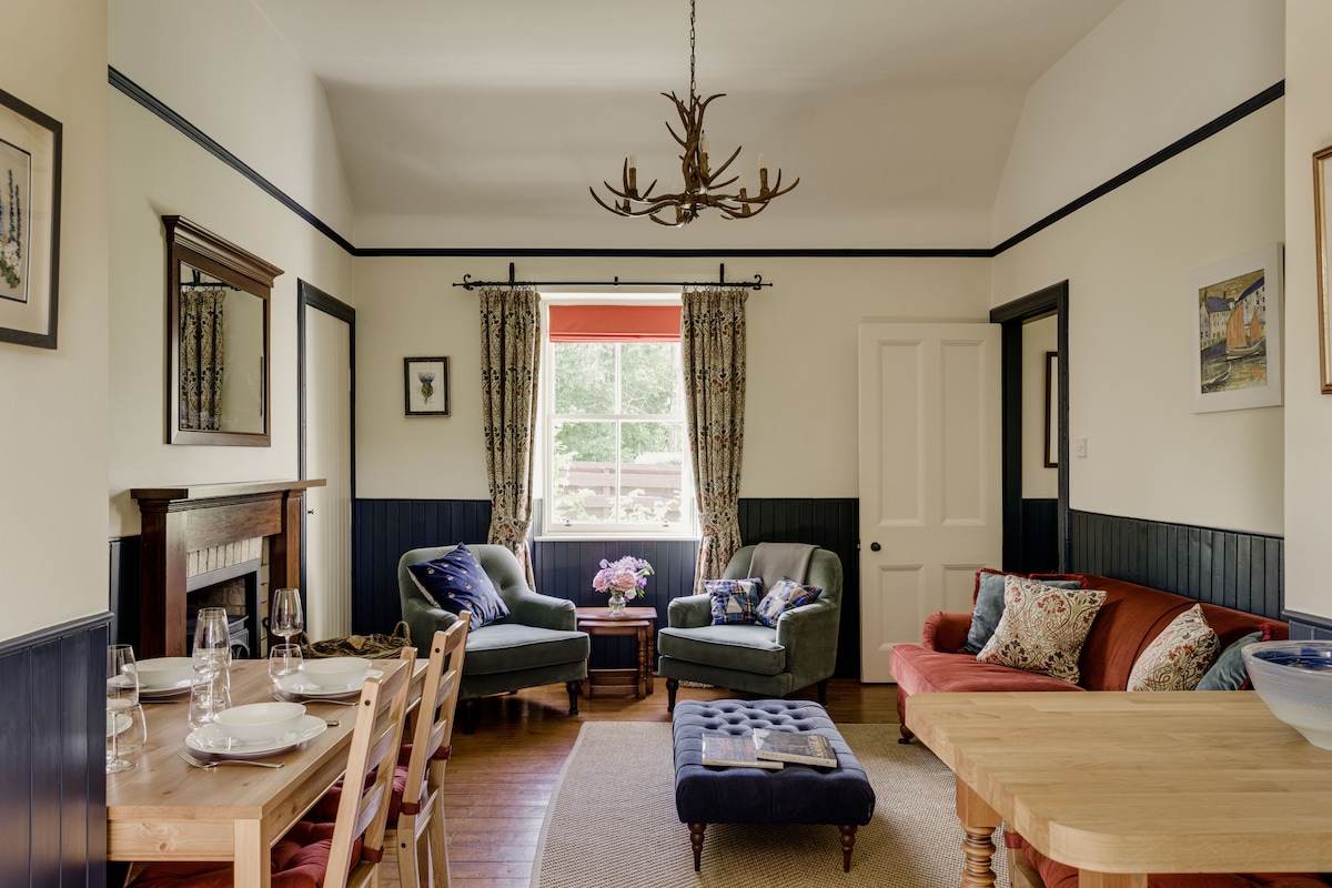 Mirna seoska kuća u Hantliju, izvan glavnih ulica, ali na laganoj pješačkoj udaljenosti od železničke stanice i centra grada. U udobnom dnevnom boravku postoji efikasan šporet na drva, a po dolasku ćete naći korpu sa drvetom. Kuhinja se nalazi iza zgrade sa pristupom maloj, zatvorenoj bašti koja je savršena za spor doručak na suncu ili večernje piće na travnjaku. Kupatilo je dostupno stepenicama na spratu. Jedva čekamo da vas ugostimo!