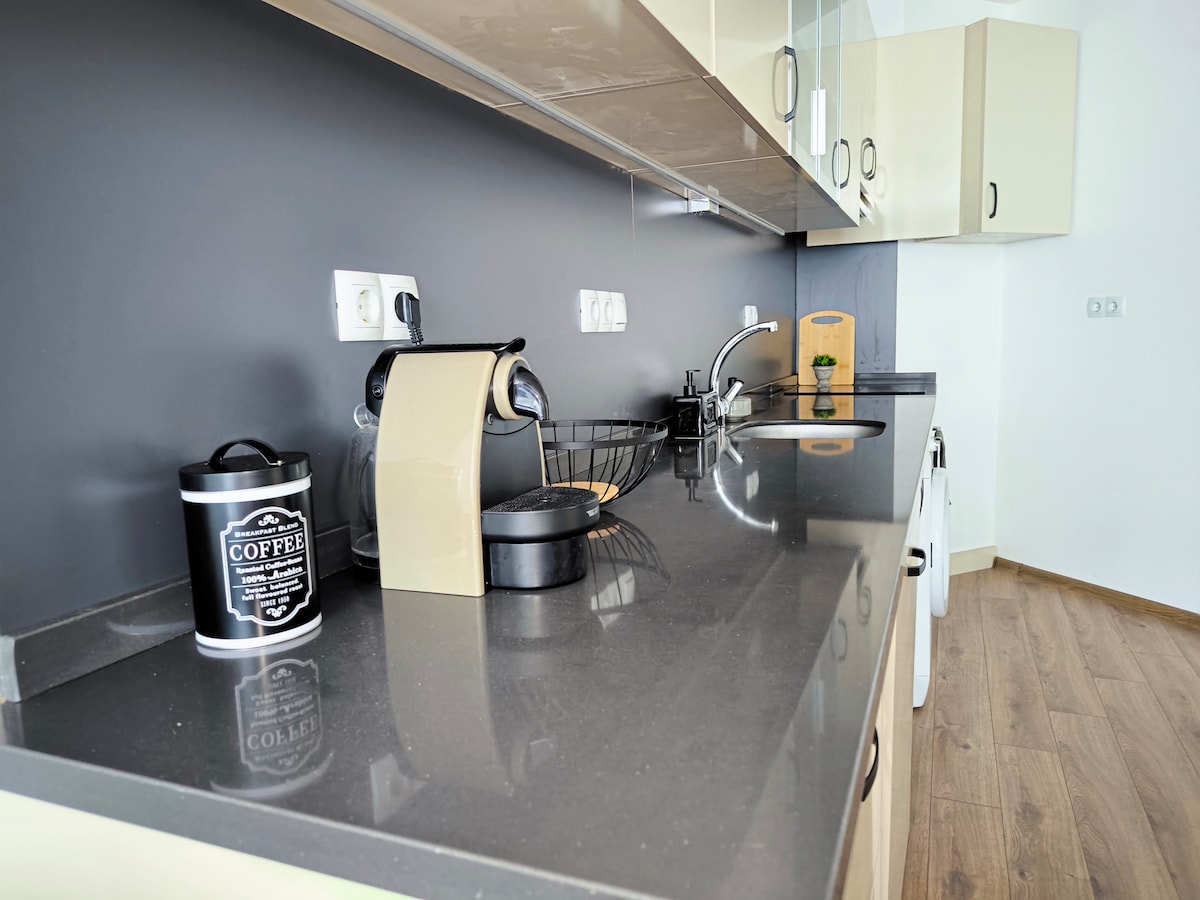 Uživajte u udobnom i elegantnom boravku u ovom prostranom stanu u centru grada, sa udobnom spavaćom sobom, dnevnim boravkom sa trpezarijom i radnim stolom, potpuno opremljenom kuhinjom, modernim kupatilom, zasebnim toaletom i privatnom terasom. Besplatan parking na ulici je dostupan u blizini, a na samo nekoliko koraka ste od Saut Parka i Nacionalne palate kulture. Sa metroom udaljenim samo 5 minuta hoda i tržnim centrom Bugarska 2 km od stana, to je savršena baza za istraživanje grada!