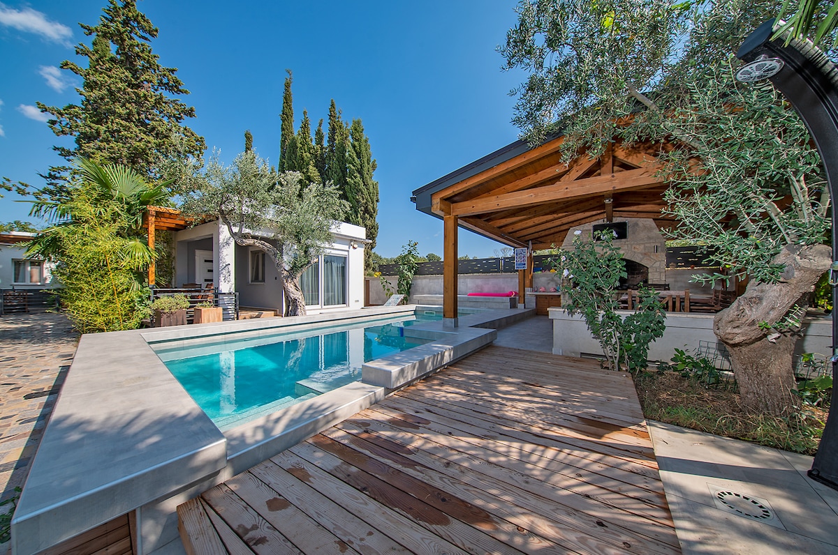 Moderna vila u Istri, preko Brijuna u blizini Pule. Okružen mediteranskom baštom, idealna je za par, ali može da primi do četiri osobe. Smještena 200 metara od plaže, kuća nudi velnes, odmor i ponovno povezivanje s prirodom. U kući se može pronaći sve što je potrebno za opušten odmor, a u bašti se nalazi jedinstveni bazen, hidromasažna kada, trpezarija i roštilj. I mnogo zelenila (mi smo prijateljski nastrojeni prema prirodi i pčelama). Objekat je u potpunosti ograđen i prikladan za kućne ljubimce.
