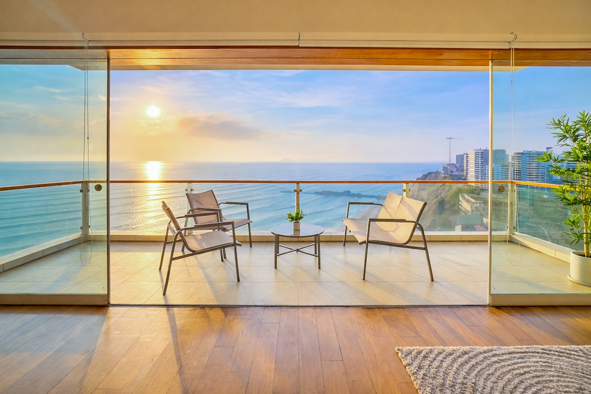 Uživajte u privilegovanom pogledu na okean iznad raskošnih zelenih obalnih parkova Mirafloresa, najboljeg kvarta u Limi. Poslušajte talase koji se sudaraju na stijenama ispod dok se opuštate ili drijemate i prošetajte šetalištem i uživajte u najboljoj hrani na svijetu! Samo nekoliko minuta hoda od malekona do savršeno slikovitog svjetionika, 5 blokova do Avenide la Mar i ~10 do Larko Mara. Uživajte u zajedničkom bazenu i roštilju na krovu zgrade!