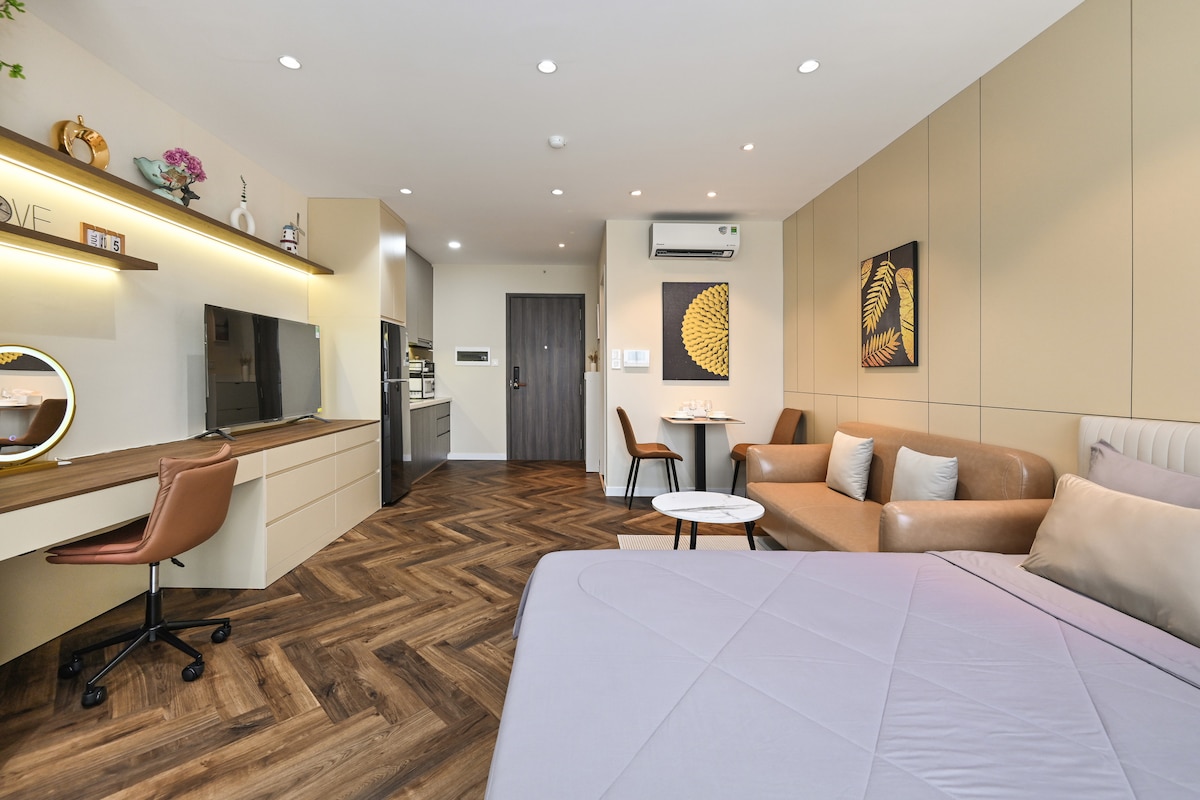 Moderni studio u Lavida Plus, u samom centru Phu My Hung. Udoban dizajn sa kompletnom kuhinjom, pametnim TV-om i balkonom za pogled na grad i opuštene noći. Savršeno za parove koji traže romantičan smještaj ili putnike koji žele elegantnu i udobnu bazu u D7. Prošetajte do tržnih centara i lokalnih mjesta. Rezervišite sada za opuštajući odmor u Sajgonu!