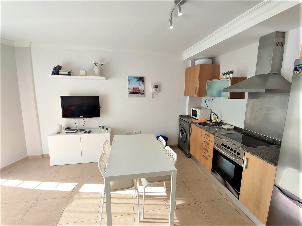 Penthaus u prvom redu sa pogledom na okean od zida do zida i noćnim zalascima sunca. Novoopremljen, klimatizovan i dizajniran za udobnost: veliki bračni krevet sa vrhunskom posteljinom, tuš sa efektom kiše, roletne za zamračenje i električna pergola. Kuvajte u potpuno opremljenoj kuhinji (mašina za sudove, rerna, Nespresso), a zatim se opustite pored velikog bazena na obali okeana sa svojim ležaljkama za sunčanje. Brzi optički internet i radni prostor sa pogledom na okean. Prošetajte do plaže Playa de la Arena i restorana na obali. Besplatan parking ispred ulaza na ulici.