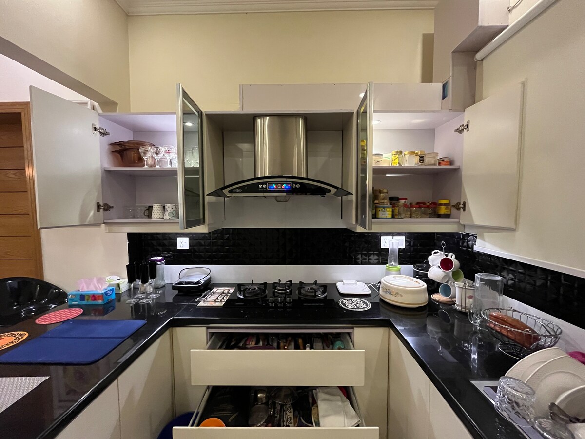 Opustite se i uživajte u luksuznom utočištu koje nudi ComfyCozy. Ova moderna vila nalazi se u bujnoj zelenoj Bahria enklavi Islamabad . Iako se veliki dio zabave može naći u okviru Bahria Enclave (Birds Aviary/ Zoo), vi ste udaljeni samo 10 minuta vožnje od plesnih fontana u Park View Society, živopisne Food Valley i jezera Rawal, što će vašem boravku dodati još više uzbuđenja. Namirnice se isporučuju na kućni prag i dodaju praktičnost. Možete dobiti i pristup TERETANI po posebnim sniženim cijenama