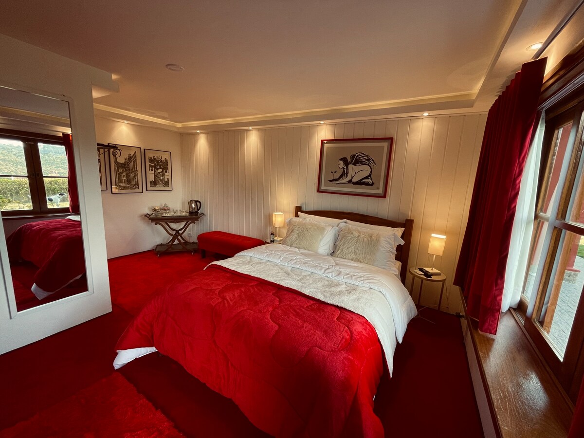 Akončegan i sa pogledom koji oduzima dah, apartman ima neusporediv stil, savršen za romantični vikend. Kao aneks glavne kuće, ima ekskluzivan ulaz i potpunu privatnost. Uživajte u velikom dvorištu sa ekskluzivnim salonom, visećom ležaljkom, kaminom i garažom. Sa aparatom za kafu, čajnikom, čašama za vino i otvaračem. Nema minibara. Ako želite kuhinju, imamo „Casa Vista e Design“ koja ima dnevni boravak, kuhinju i prima do 4 osobe ;) Naše dvije super pitome ženke žive na imanju*
