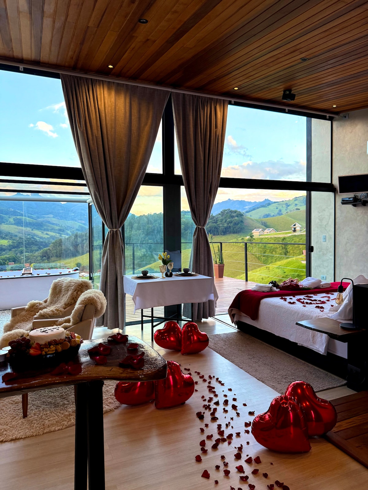 Relaxe neste lugar único e tranquilo. Vista maravilhosa . Lugar para casais apaixonados Chalé aconchegante, tranquilo. Banheira dupla aquecida com hidromassagem que fica no deck externo com vista para as montanhas Piscina com borda infinita com vista para as montanhas. O quarto cama queen e ar condicionado No banheiro chuveiro a gás e torneiras aquecida Disponibilizamos roupões de banho Nossa cozinha é toda equipada com Cafeteira , forno Elétrico , fogão elétrico de 5 bocas,