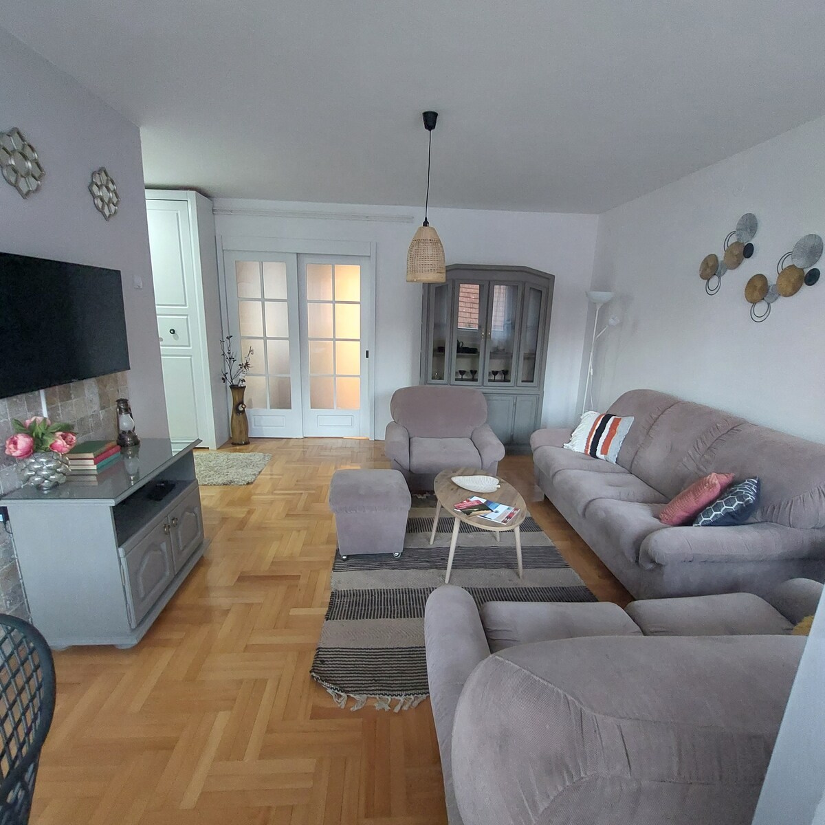 Opustite se u ovom mirnom, elegantnom prostoru. Četvrti sprat u zgradi od pet sprata sa liftom. Dobar pogled, miran kraj na samo 500 metara od strogog centra grada a na svega nekoliko metara od sportskog kompleksa! Kompletno opremljen novim stvarima, pogodan za duzi boravak. Masina za pranje veša, mašina za sušenje veša su samo neke od pogodnosti!
