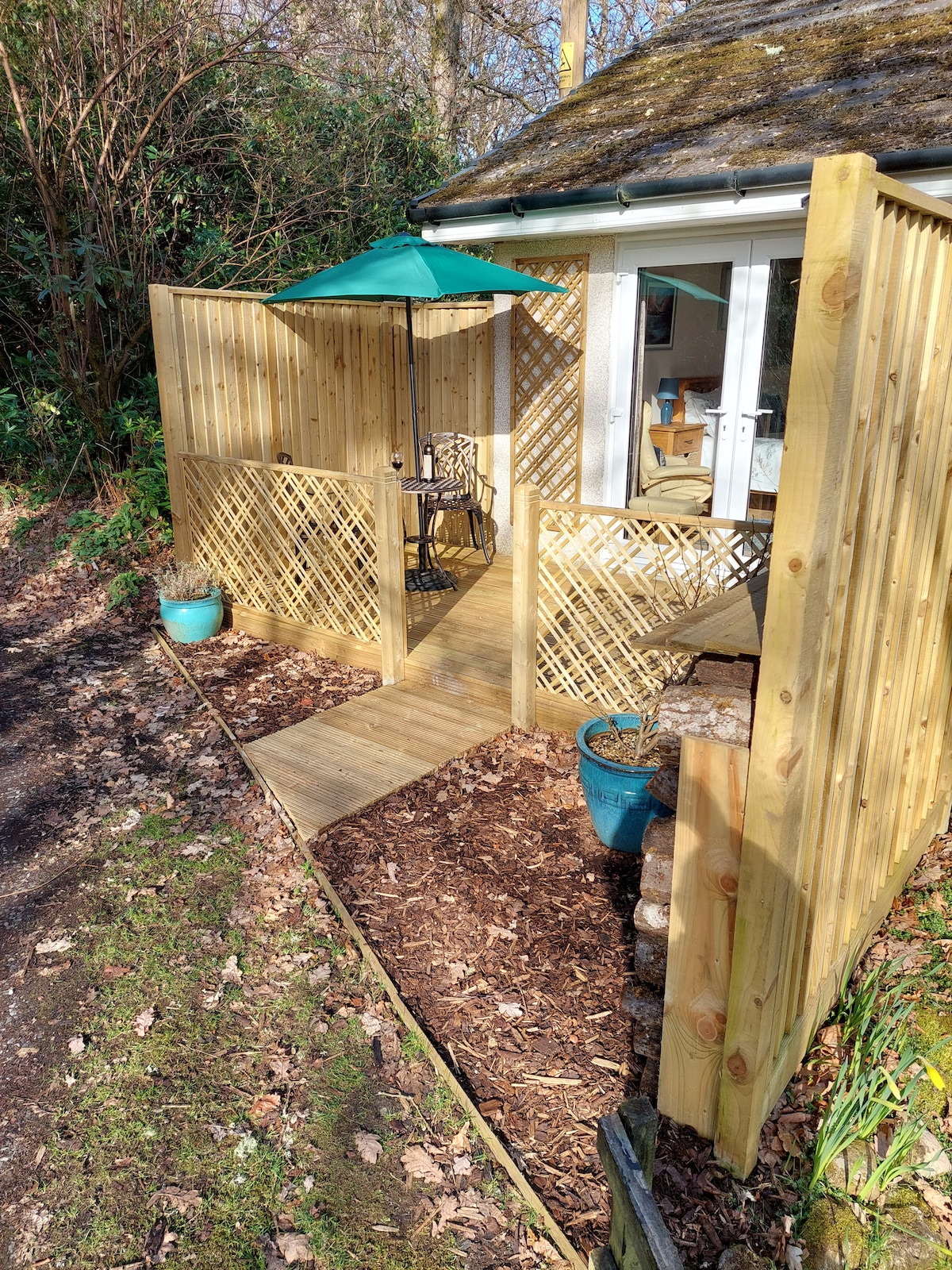 Mirna i tiha brvnara prikladna za kućne ljubimce s terasom i unutrašnjim dvorištem. Brvnara ima ograđenu zaštićenu baštu na kraju privatnog zajedničkog prilaza. Okružen šumom i divljim životinjama, sa malim potokom koji teče u blizini. Brvnara je potpuno opremljena i ima otvoreni stambeni prostor sa potpuno opremljenom kuhinjom. Bar za doručak, salon sa Smart TV-om od 50"i Xbox-om. 1 dvokrevetna spavaća soba, tuš-kabina i privatna terasa i prostor za sjedenje sa roštiljem i ognjištem. * Samo za odrasle. Molim vas, bez beba ili djece.