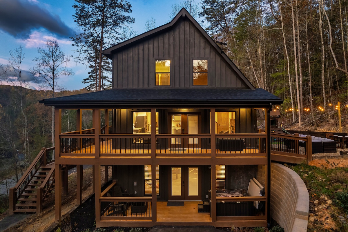 Modern w/ Rustic Undertones - Red Fox Den, novoizgrađena moderno uređena brvnara koja se nalazi u zajednici Cobbly Nob. - Veliki bračni apartman na glavnom spratu i 2 bračna apartmana na donjem spratu, svi sa privatnim kupatilima. - Plafoni od 14 stopa u glavnom dnevnom boravku, glavnoj spavaćoj sobi i trpezarijama - Smještena samo 13 milja od centra Getlinburga, zajednica nudi savršenu ravnotežu praktičnosti i privatnosti. - Praktičan stan, popločan parking. Predivan pogled