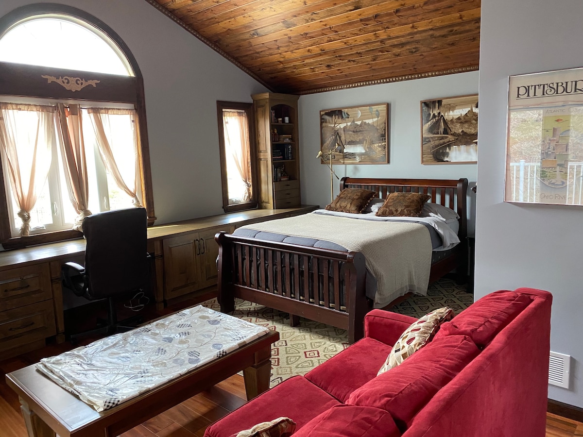 Ovaj mini studio je za svakoga kome je potreban uredan, čist i kul smeštaj. Ima novi bračni krevet, kauč na razvlačenje, čajnu kuhinju i kupatilo sa privatnim ulazom na 3. spratu prelepe vile u Pitsburgu iz 1890-ih. To je veličina velike sobe i veoma dobro funkcioniše sa gostima koji planiraju da rade ili izlaze na uživanje u gradu i vraćaju se na bezbedno, čisto i udobno mesto za punjenje tokom noći(nije pogodno za decu mlađu od 10 godina).