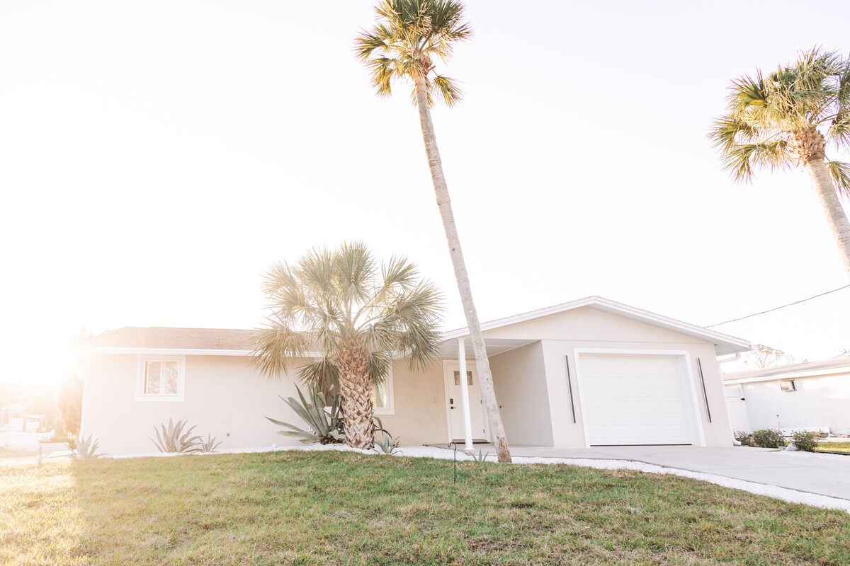 Welcome to our charming and cozy retreat, where bright & airy simplicity meets coastal serenity. New POOL AND HOT TUB! Catch a sunset on the large white patio chairs overlooking the water or lounge in the floor-to-ceiling-windows air conditioned sunroom! Bringing the BOAT? 🛥 Launch AT THE HOUSE w/our private boat ramp and 30' ft dock to tie up in backyard! Got BEACH? ⛱️ We are only 8 min from Englewood Beach & restaurants! Chairs+Umbrella+towels provided!
