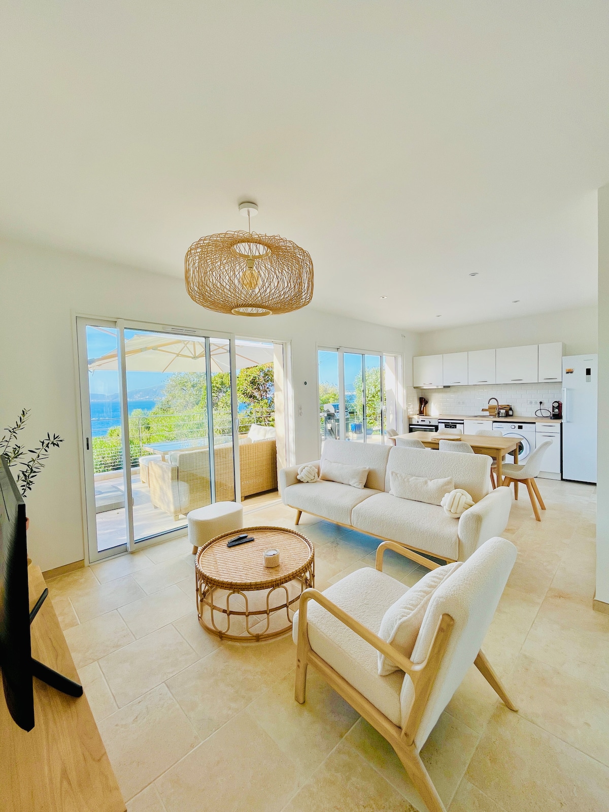 T3 sa veličanstvenim pogledom na more, nov, udoban, uredan savremeni dekor, 50 m od uvale i 100 m od plaže Agosta. Velika privatna terasa od 20 m², panoramski pogled (180°): poluostrvo Isolela, ostrva Sanguinaires, Ajačo, plaža Agosta; opremljena za obroke i opuštanje. Unutra: 60 m² potpuno klimatizovanog prostora, veliki dnevni boravak-trpezarija, 2 spavaće sobe sa krevetima od 160 cm (jedna sa pogledom na more) i veliki ormari, odvojena potpuno opremljena kuhinja, mašina za pranje veša, mašina za sušenje veša.