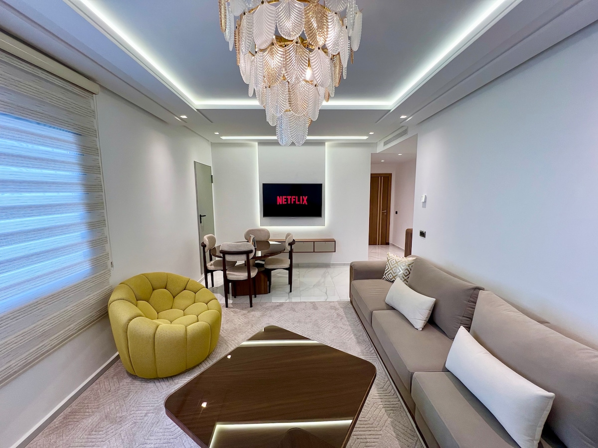 Prekrasan moderan stan okrenut prema ivici Tangera, koji se nalazi u sigurnoj rezidenciji sa garažom i dva lifta. Sastoji se od dvije spavaće sobe, uključujući glavni apartman sa privatnim balkonom i Smart TV-om, dječije sobe sa dva kreveta, svijetlim dnevnim boravkom sa pristupom balkonu i Smart TV-om, potpuno opremljenom kuhinjom i prijatnom trpezarijom. Centralni klima-uređaj, mašina za pranje sudova, mašina za pranje veša i sva udobnost potrebna za prijatan boravak kod porodice ili prijatelja.