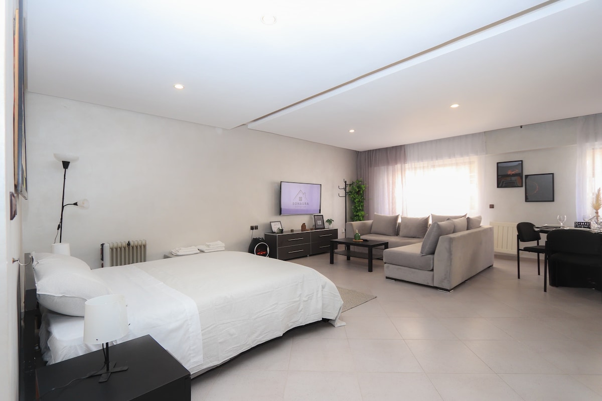 Odsjednite u udobnom stanu na dva minuta od ivice Tangiera🌊: . • Prostrana spavaća soba s bračnim krevetima🛏️. • Svijetla dnevna soba sa kaučem na razvlačenje 🛋️ i namještenim balkonom☀️. • Opremljena kuhinja: aparat za kafu, mikrotalasna rerna, posuđe🍳. • Brza Wi-Fi mreža 📶 i 2 velika televizora s 📺pretplatama Praktično se nalazi na dva minuta hoda od plaže Tanger i Marine🏖️, restorana 🍽️ i atrakcija🎨. Samostalna prijava 🔑 za nezaboravan boravak ✨
