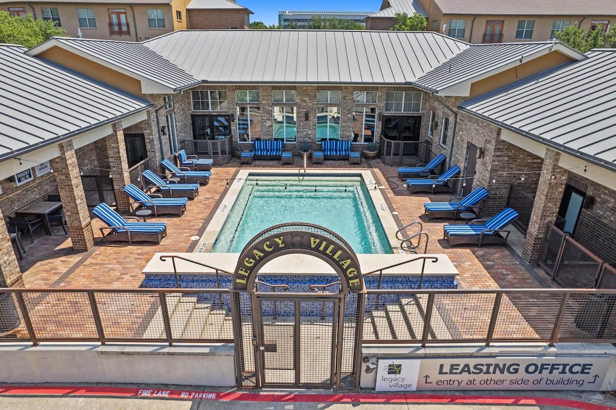 Pobjegnite u ovaj prelijepo uređeni smještaj s 1 spavaćom sobom u 750. stanu, s bračnim krevetom kategorije Luxe, unutrašnjim dvorištem s pogledom na dvorište i bazen. Savršeno za opuštajući odmor ili mirnu noć. Bilo da ste ovdje u slobodno vrijeme ili poslovno, cijenićete namjenski radni prostor i brzi Wi-Fi i 2-Roku televizora. In-unit W/D Located minutes away from BSW Heart Hospital, top shopping, local eateries, near both Dallas North Tollway and President George Bush Turnpike. Zatražite od nas preporuke.