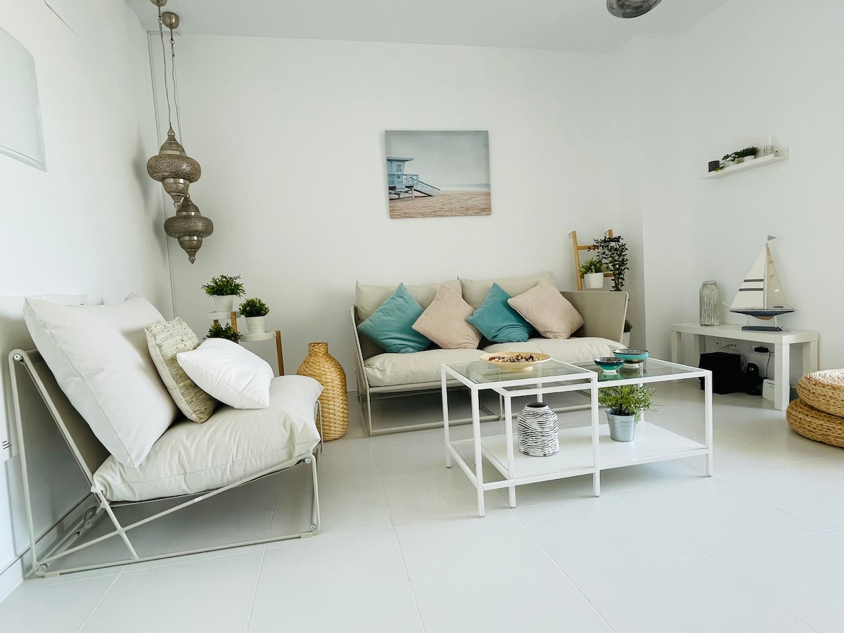 Bright and modern beachfront apartment in Calpe, right by the sandy beach and within easy walking distance of shops, restaurants, and the promenade. Sleeping up to 5 guests, it offers 2 bedrooms, 2 bathrooms, sea views, a covered terrace, a fully equipped kitchen, air conditioning, bed linen and towels, and access to the communal outdoor pool in summer and the indoor heated pool and spa area during the cooler months.