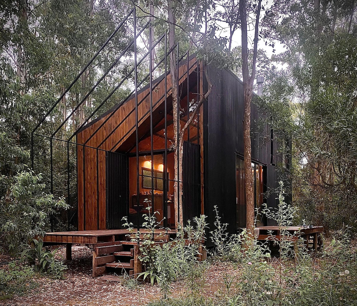Casitas_del_ensueno: Cabaña a 50m. de la playa en medio de bosque nativo. Construida con materiales cálidos y de diseño, aberturas doble vidrio, estufa a leña, AC frio/calor, calefactores en los cuartos. Amplio espacio abierto living-cocina con todo para 4 huéspedes (max. 3 adultos), 1 dormitorio en suite con salida al deck, 2do dormitorio con cama nido (twin) y 2do baño. Wifi por FibraOptica. Pura luz y bosque a un paso del río. Estacionamiento 2 autos, parrillero, TV, hamaca, sillas de playa.