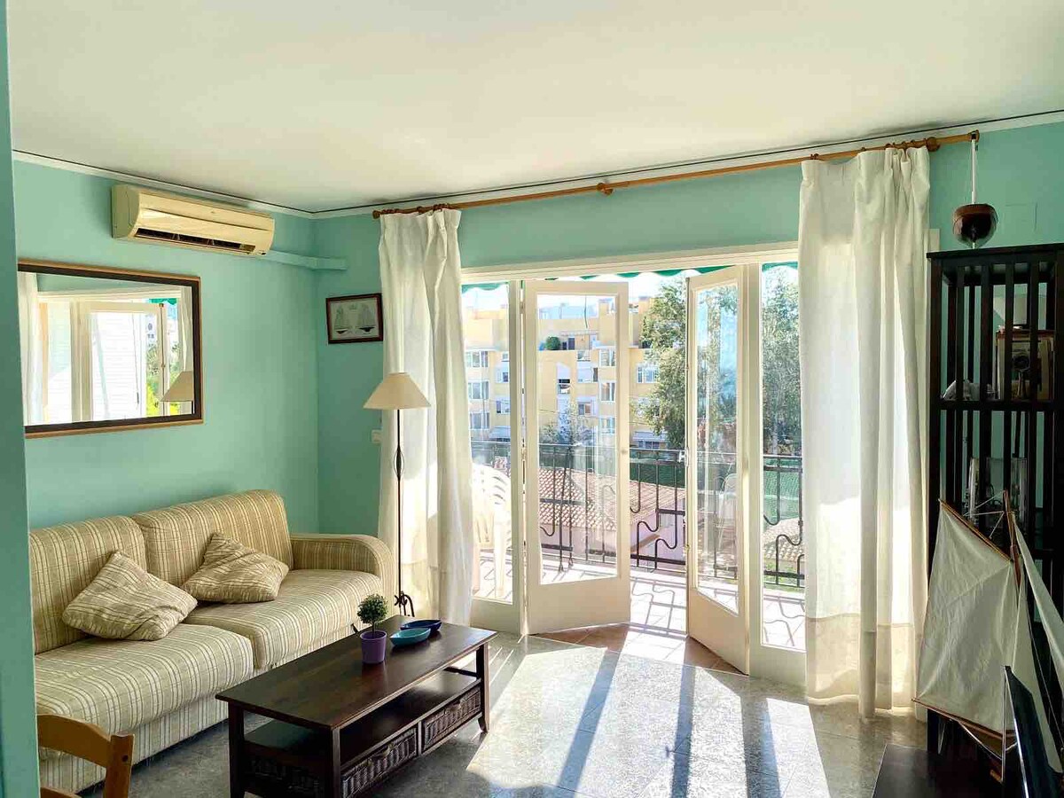 Klimatizovani apartman na odličnoj lokaciji uz more sa direktnim pristupom plaži. Prijatan, svijetao sa balkonom i veličanstvenim pogledom za obroke, uživanje u morskom vazduhu i veličanstvenim izlascima sunca. Besplatno: Wi-Fi, parking – 2 bicikla i pribor za plažu. Opremljena kuhinja. 10 miliona hoda do centra grada, njegovog noćnog života,restorana,prodavnice i Marina , polazna tačka za Ibicu - trajekt Formentera i svi drugi jednodnevni izleti. Supermarket u blizini