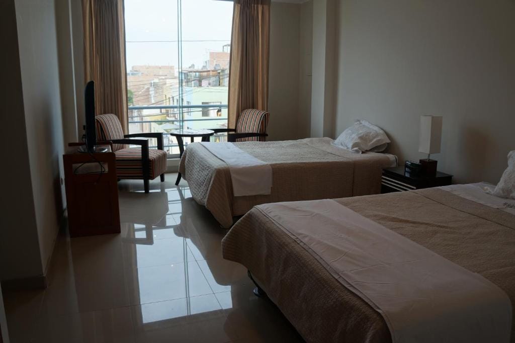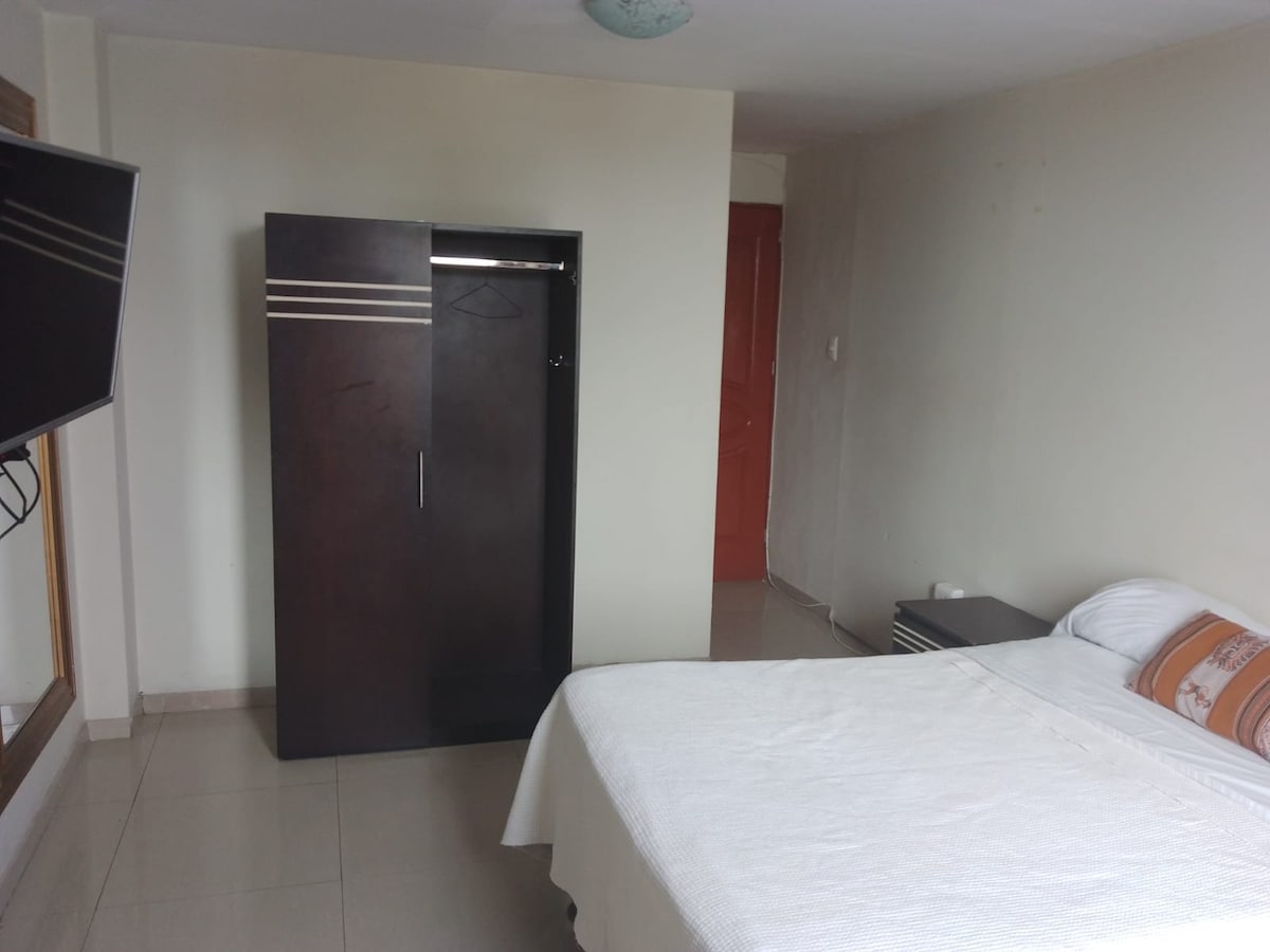 Habitación Cuádruple cama de 2 plazas más litera de 1 plaza, baño propio con ducha agua caliente, jabón y shampoo, ubicada en el tercer piso. Smart Tv 55" Samsung 4K Crystal. Toallas de cuerpo, mano y pies, cortinas de tul y blackout, almohadas y cojines en la cama. Wifi alta velocidad en todo el Hotel.