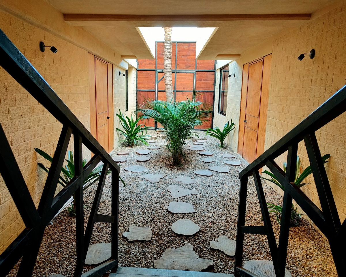 Suite nueva, minimalista y privada a solo 5 minutos caminando de la playa principal de Puerto Escondido. Ideal para parejas, con cama matrimonial, aire acondicionado, wifi, Smart TV de 65” y entrada independiente para mayor privacidad. Disfruta un espacio elegante y tranquilo en zona céntrica, con café de cortesía y detalles pensados para una estancia cómoda cerca del mar, perfecto para descansar después de la playa y explorar caminando lo mejor de Puerto.