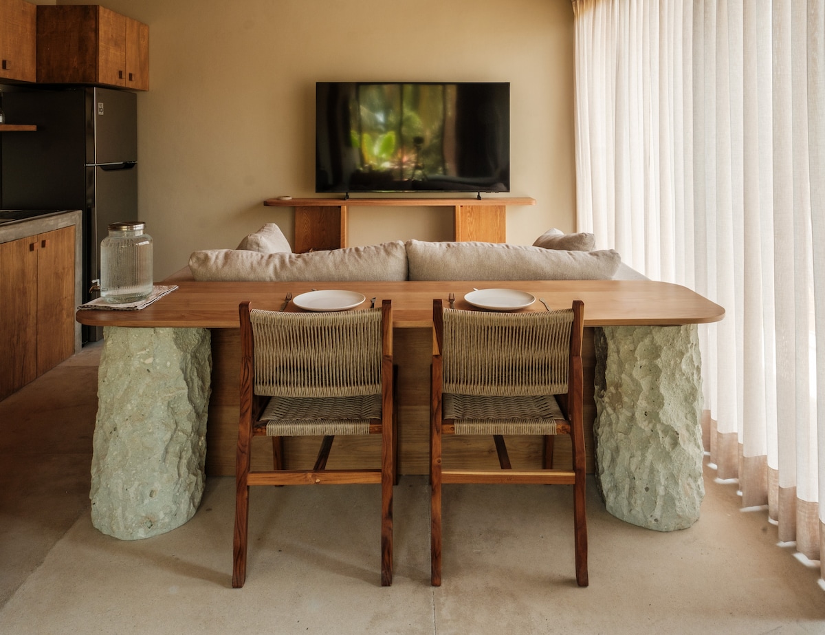 Prekrasan i prostran apartman sa bračnim krevetom, okretnim TV-om od 50inča, klima-uređajem, kuhinjom, kupatilom i privatnim bazenom. Osjetite spokoj, opustite se u hidromasažnoj kadi privatnog bazena i uživajte u udobnosti svega što vam je potrebno za ugodan boravak. Nalazimo se u Punta Zicateli, na 7 minuta hoda od plaže, glavnog mjesta za surfovanje, restorana, barova i šoping zone. Blizu svega, ali daleko od gužve i vreve zabave. Imamo Starlink internet