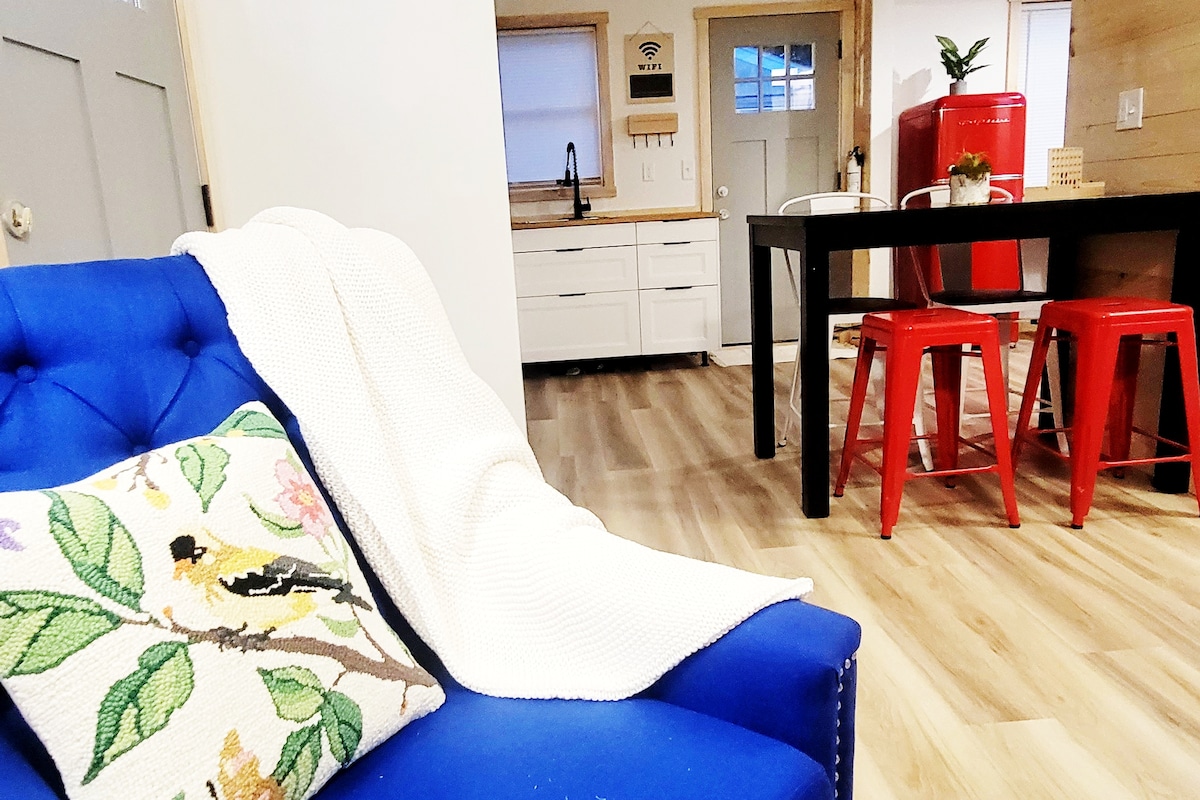 Uživajte u mirnom boravku u našem privatnom podrumskom apartmanu. Uživaćete u visokim plafonima, prirodnom svjetlu i posmatranju divljih životinja u našem dvorištu! Privatni ulaz sa zadnje terase i parking izvan ulice za 1 automobil. Uključuje: 1 spavaću sobu s bračnim krevetom, kupatilo s tuš-kabinom/kadom, potpuno opremljenu kuhinju, dnevni boravak s futon kaučem, podni dušek i krevet za pakovanje. Zatražite pravila za kućne ljubimce prije rezervisanja. Ako ste zainteresovani za blokirani datum, pošaljite mi poruku (novi posao=manja sedmična dostupnost). 10% popusta za edukatore🏫❤️.