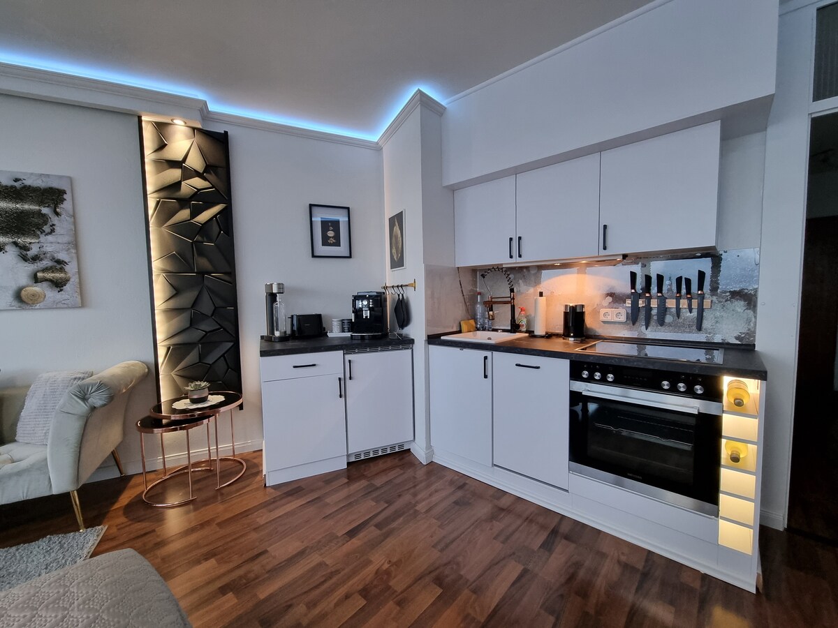 Lehnen Sie sich zurück und genießen Sie entspannte Tage in dieser stilvollen, lichtdurchfluteten Unterkunft. Auf drei offen verbundenen Ebenen bietet die Wohnung ein großzügiges Raumgefühl. Die Galerie verbindet Wohn- und Schlafbereich und schafft einen besonderen Blick von der oberen Ebene ins Wohnzimmer. Im Erdgeschoss erwartet Sie eine moderne Küche mit integriertem Essbereich – perfekt zum Ankommen und Wohlfühlen.