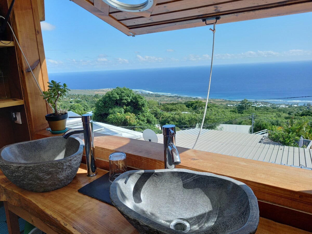 Na zapadnoj obali između mora i planine, u velikoj bujnoj tropskoj bašti s pogledom na okean, smještaj u prirodi sa nezavisnim ulazom za 2 osobe. Suvi toalet i spoljni tuš ispod džinovskog papirusa. Možete da pripremate obroke i jedete u kuhinji usred vegetacije, na terasi s pogledom na more... ili negdje drugo u bašti. Vrlo mirna četvrt. Iznajmljujemo električne bicikle. Pozajmica za dva para peraja-maske-tuba i razne društvene igre.