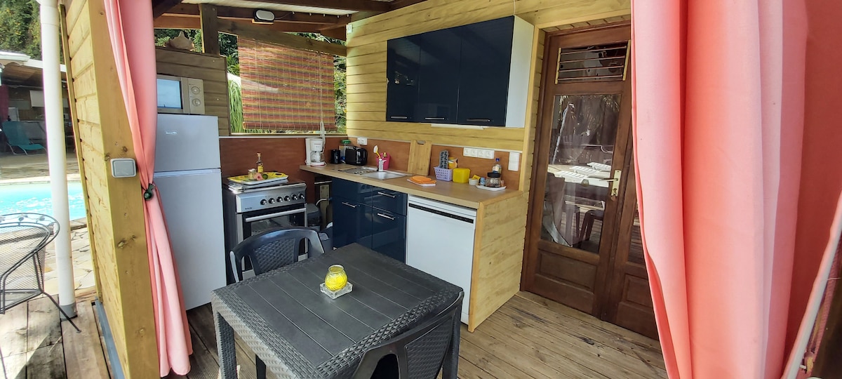 Šarmantno ukusno uređen bungalov koji se nalazi između mora i planine, sa veličanstvene drvene terase sa đakuzija. Gosti mogu da uživaju u moru dokle god pogled seže i uživaju u udobnosti svake od soba otvorenih prema spoljašnjosti. Savršena lokacija za pristup vodopadima karbeta 10min, trajektna stanica za Saintes 7min, plaže crnog peska 3min, Soufričre 25min. Odlično za porodice, prijatelje...