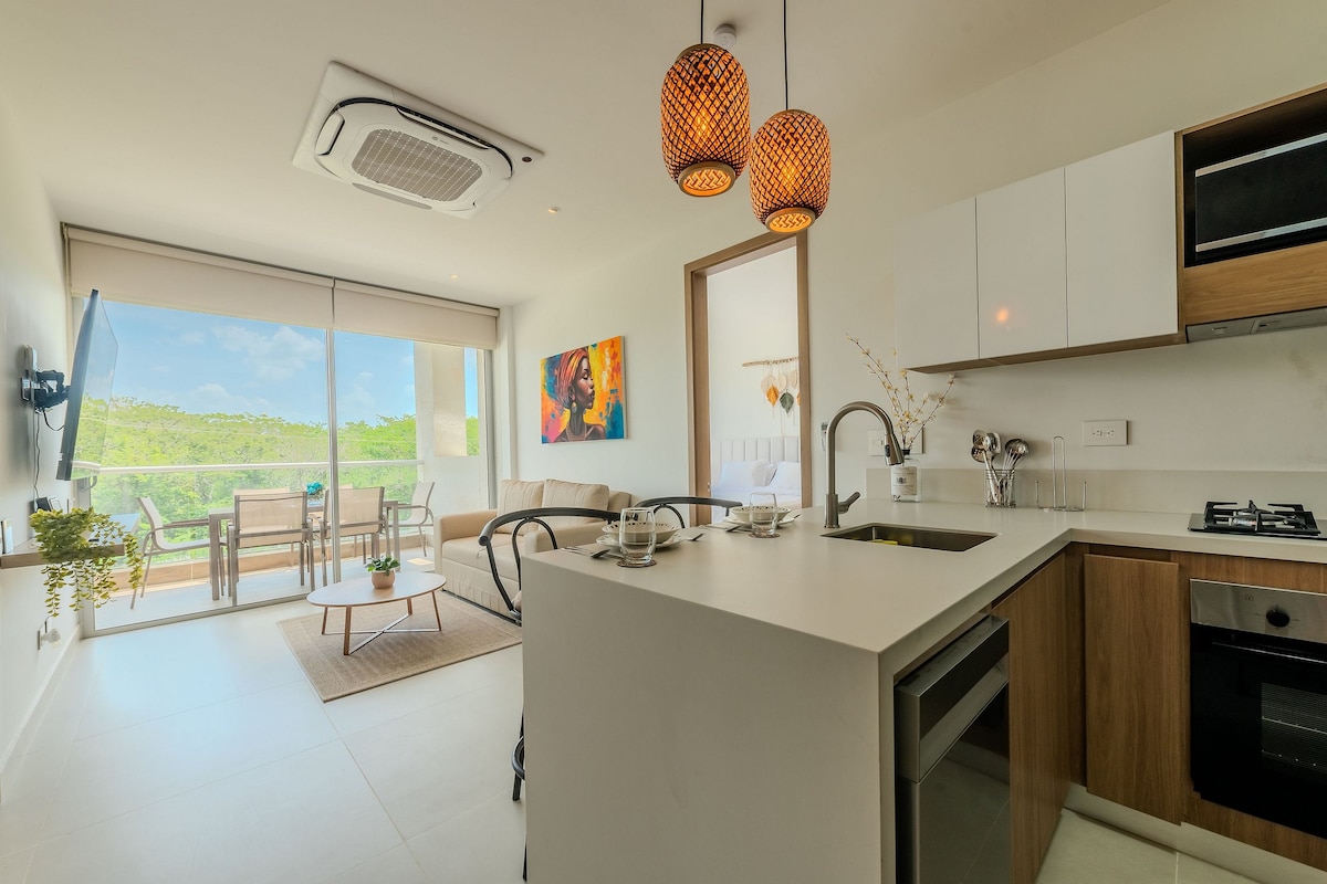 Apartamento moderno de 1 habitación en el exclusivo Condominio Bahía Kristal, ubicado en la zona norte de Cartagena, ideal para ejecutivos, parejas y familias pequeñas. Cuenta con aire acondicionado, Wi-Fi rápido, habitación con cama queen, cama auxiliar y sofá cama, baño con agua caliente, sala confortable, espacio de trabajo, TV, cocina totalmente equipada y lavadora con zona de ropas, perfecto para estancias cortas o prolongadas.