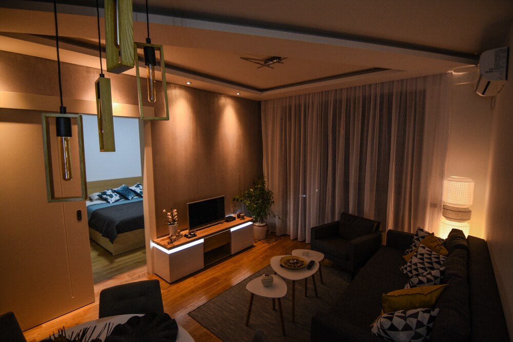 Modern, fully renovated apartment in New Belgrade; just a short walk from Sava Centar and Belgrade Arena. Located on the 1st floor in a quiet residential area with easy access to the highway and city center. Enjoy self-check-in, a comfy king-size bed, a fully equipped kitchen and bathroom, fast free WiFi, and a UHD Smart TV. Designed for comfort and convenience. Late checkout is available for an additional fee, depending on availability.
