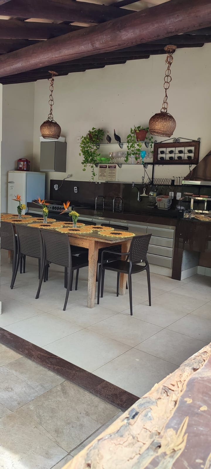 Sítio completo com piscina, churrasqueira e sinuca a 2km do centro de Porteirinha. Casa com 2 pavimentos, 3 quartos, sala e cozinha equipada (cooktop, fogão industrial, geladeira e freezer). São 3 quartos com 5 camas de casal, 1 de solteiro e colchões extras. Ventiladores de parede. Acomoda tranquilamente até 13 pessoas. Possui 2 banheiros internos e 1 externo. Área externa com churrasqueira, fogão a lenha com forno, sinuca, muito verde e 10 jogos de mesas com cadeiras.