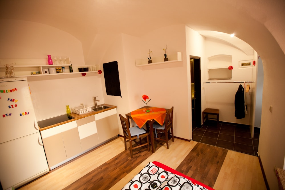 LOKACIJA, LOKACIJA, LOKACIJA. Pogodno za LAKO, A NE OTMJENE PUTNIKE. Potpuno opremljen, ali OSNOVNI, NE LUKSUZNI studio apartman u centru grada. Najbolja opcija za jednostavne putnike koji cijene najbolju lokaciju, spoljašnji prostor u strogom centru grada i mali niski budžetski studio. Definitivno malo čudno mjesto u drevnoj zgradi iz 16. vijeka, tako da ne očekujte modernu, ali istorijsku atmosferu. Pogodnije za putnike s ruksakom na leđima i jednostavne putnike.