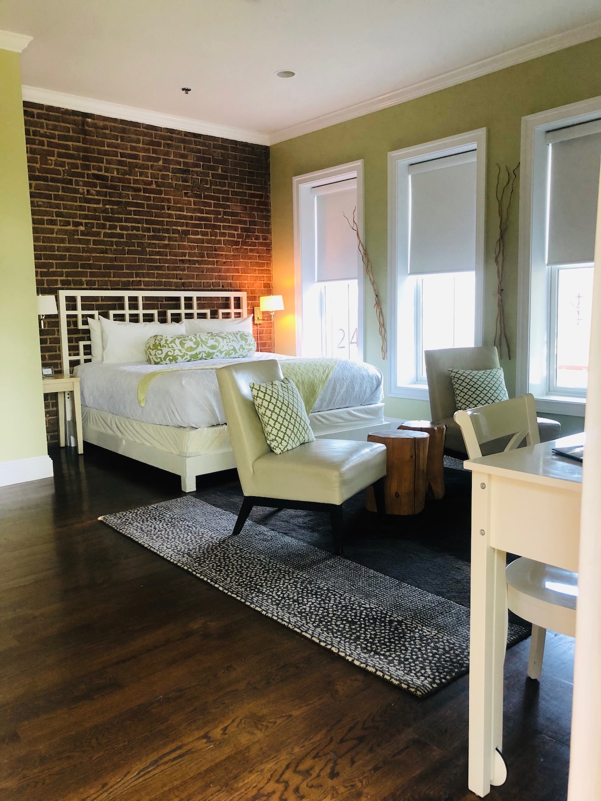 Omiljeno za goste - apartman na Verdeu može da se pohvali bračnim krevetom sa italijanskom posteljinom, udobnim bademantilima, plinskim kaminom, balkonom, velikim privatnim apartmanom sa PARNOM TUŠ-KABINOM, dvostrukim umivaonikom i još mnogo toga! Ova svetla, vesela soba gleda na prodavnice u ulici Dejvis i poziva vas da uživate u pogledu sa više prozora. Svakako možete da vidite i osetite šarm malog grada koji izlazi odozdo. Verde se nalazi na drugom spratu hotela. Nema liftova. Morate da hodate jednim spratom do sobe.
