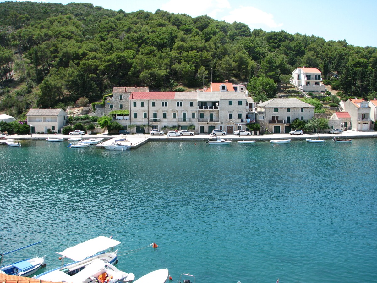 Kamena lepota iz 1467. godine, spomenik kulture koji se nalazi u istorijskom jezgru Pučišća - jednog od 15 najlepših malih gradova u Evropi. Restaurirani dvorac daće vam trenutke mira i tišine jer je prednja strana dvorca okrenuta prema moru i gradu, a iza njega se nalazi bašta, dvorište i tri terase za trenutke odmora. Stan na prvom spratu se sastoji od trpezarije i dnevne sobe, kuhinje, kupatila i spavaće sobe sa pogledom na baštu.