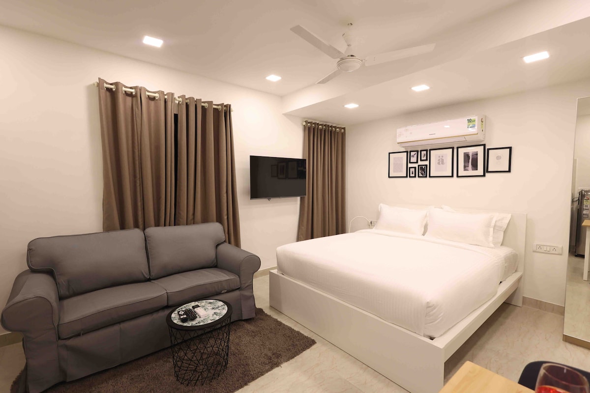 Odsjednite u luksuzu u našem potpuno namještenom stanu 1BHK, koji nudi udobnu spavaću sobu, dva kupatila (jedna povezana spavaća soba, jedno zajedničko ) i potpuno funkcionalnu kuhinju s kućanskim aparatima i osnovnim priborom za kuvanje. Opustite se u prostranom dnevnom boravku s velikim pametnim televizorom i elegantnim dizajnom enterijera. Uživajte u luksuznom namještaju koji stvara dom daleko od doma. Savršen i za kraće i za duže boravke, ovaj stan obećava udobnost i praktičnost na vrhunskoj gradskoj lokaciji. Rezervišite smještaj za izvanredan boravak!