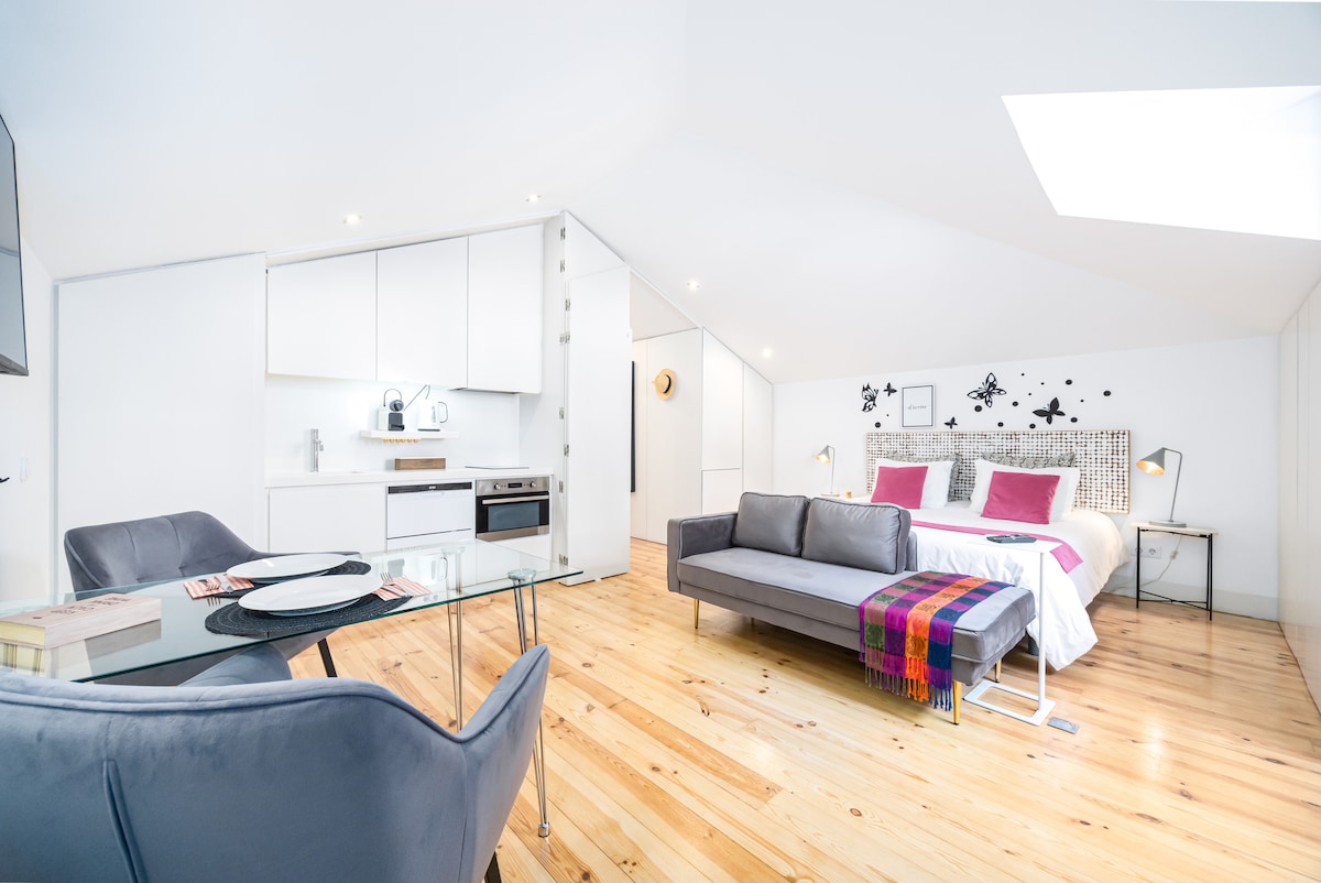 Elegantan, miran i centralni studio apartman sa: 🛌 Vrlo udoban bračni krevet (širine 180–220 cm), luksuzni jastuci i meka bijela posteljina 🚿 Mermerno kupatilo sa kvalitetnim peškirima i besplatnim toaletnim potrepštinama ❄️ Klima 👗 Mašina za pranje i sušenje veša 🛗 Lift 👨🏻🍳 Kuhinja 📶 Wi-Fi 📺 Smart TV 🧼 Besprijekorno čisto 🍷 Živahno područje sa mnogo restorana, barova i kafića 📍 Pešačka udaljenost do Šijada, Bairo Alta i Kajš do Sodrea 🚋 Direktno na tramvaju 28 🛒 Supermarket je udaljen 1 minut