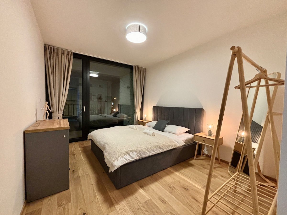 Veoma udoban moderno uređen stan sa potpuno novom kuhinjom, kupatilom i dva bračna kreveta, idealan za porodicu od četiri ili dva para. Odlična lokacija - nalazi se u mirnom delu grada u blizini stanice Andel, gde možete da idete metroom/tramvajem i stignete pravo do centra za 10 minuta ili da stignete negde drugde. Postoji šoping centar, mnogi restorani i park u neposrednoj blizini.