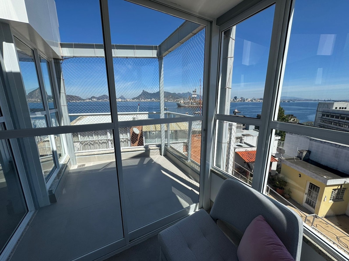 Lindo apto montadíssimo , alto luxo e muito bom gosto, vista deslumbrante para praia da boa viagem em Niterói. Até 4 hóspedes. Curta este espaço top .e também os fogos da virada de icarai . São 2 aptos por andar, com sala de jantar . sala de estar de frente para o mar sendo 2 suítes privativas + 1 escritório com vista para o mar e 1 lavabo . Suite 1 - 1 cama casal suite 2 - 1 cama de solteiro , podendo transformar em cama casal . Escritório: 1 cama de solteiro TODAS AS JANELAS TELADAS