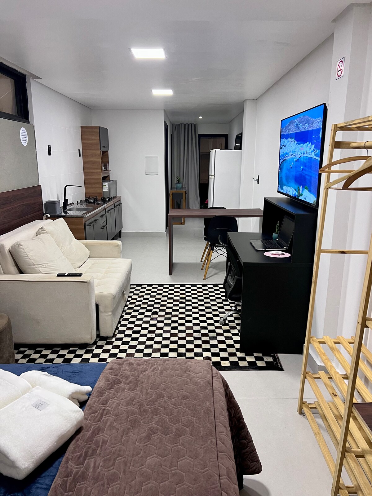 Potpuno nov, idealan za one koji putuju poslovno ili u slobodno vreme, odlična lokacija, 300 metara od pijace i glavne avenije sa nekoliko restorana, na 10 minuta od centra Floripe. Garsonjera je dizajnirana da udobno dočeka osobu ili par. Wi-Fi, TV, frižider, šporet, mikrotalasna rerna, aparat za kafu, kuvalo za vodu i osnovni pribor za kuvanje. Zgrada takođe ima bazen, fitnes centar, liftove, prostor za kućne ljubimce, vešernicu, zasebnu garažu.