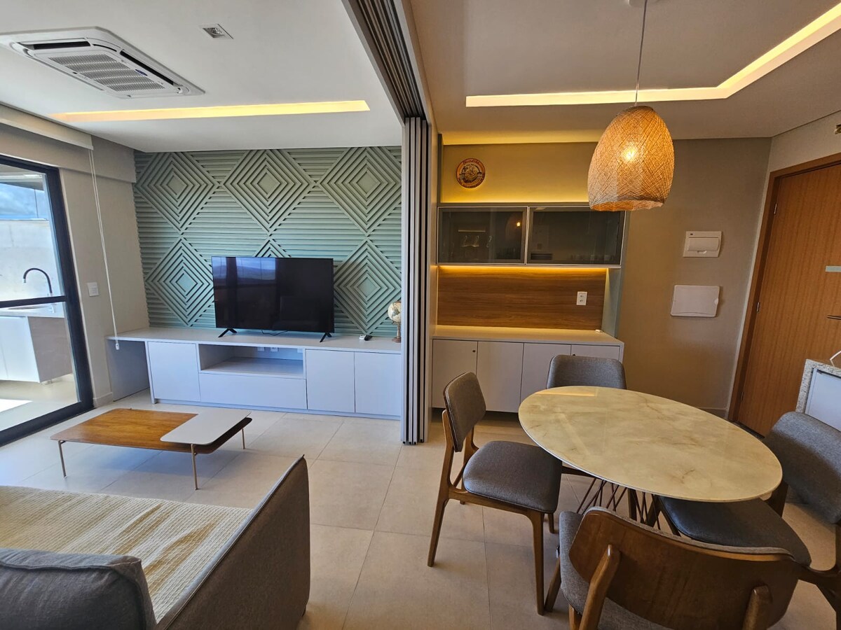 Apartman u Praia dos Carneiros koji se nalazi u ECORESORT-u, primorskom naselju pored crkve Sao Benedito (Igrejinha dos Carneiros), kompletna infrastruktura za slobodno vreme, lift, besplatan parking, bazeni, sportski tereni u blizini i 24-časovno obezbeđenje. Apartman je dizajniran sa dva udobna bračna kreveta, odvojenim, pametnim TV-om, gurmanskim balkonom i opremljenom kuhinjom. Može da primi do 4 osobe u bračnom krevetu, a u ponudi je posteljina i peškiri (djeca i bebe su uključeni u broj).