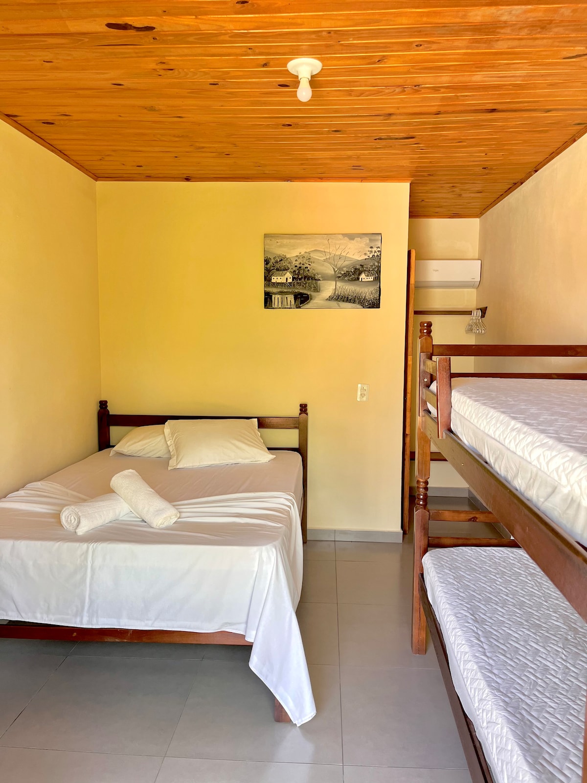 Chalé pé na areia in a gated condominium, insurance with cameras and private parking. Ima 1 spavaću sobu sa bračnim krevetom, garderobu, ogledalo, vešalicu, jastuke, plafonski ventilator i 1 kupatilo. Soba može da primi još 2 osobe jer ima bicama, pored dva kauča, smartv-a, frižidera i stola za obroke/rad i kompletnu kuhinju sa fogaom, sudoperom, loncima, posuđem, priborom za jelo, aparatom za sendviče itd. Na TV-u su Netflix, YouTube , globoplay i nekoliko laganih TV kanala