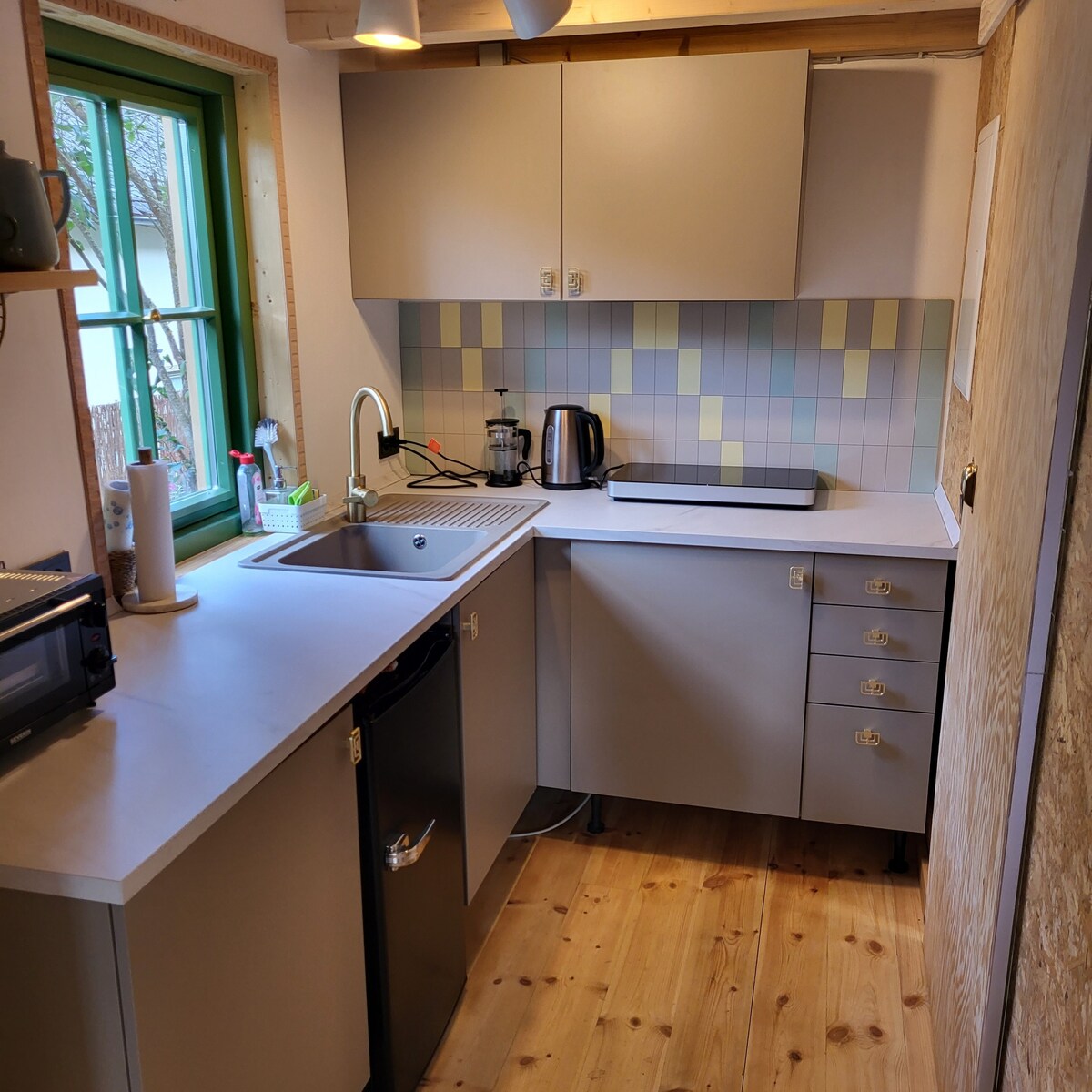 Upoznajte život u maloj kući u romantičnoj prirodi. Održiva zgrada je u potpunosti dizajnirana i izgrađena u kući. Visoki standardi dizajna i materijala, kao i pogled koji oduzima dah iz panoramskog dnevnog boravka, ne ostavljaju ništa da se poželi. Glazirani dnevni prostor s pogledom na prirodu samo je jedna od posebnosti. Na terasi se nalazi privatna hidromasažna kada. Kuhinja je potpuno opremljena. Hidromasažna kada se može koristiti tokom cijele godine.