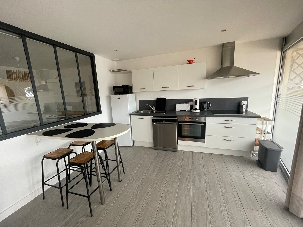 Svijetli stan od 35 m2 sa terasom, idealno smješten, u blizini svega, prodavnica, plaža, obalnih staza, pijace. Sve je to šetnja! Préfailles je porodično odmaralište na obali Žada u blizini Pornića. 30 minuta porničnim biciklom 15 minuta automobilom 9 minuta biciklom od Pointe Saint Gildas i ravnice na moru.