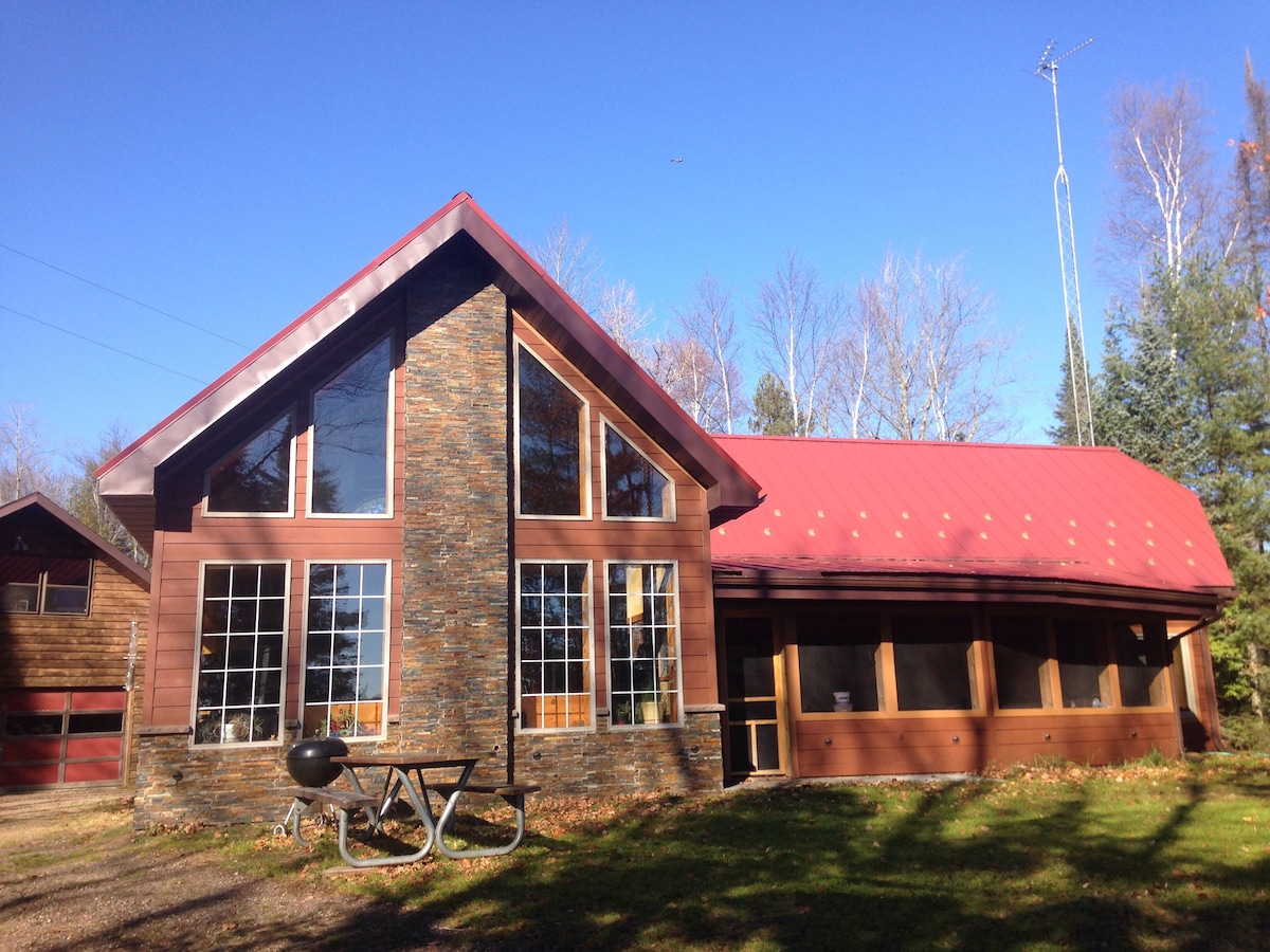Ovaj prilagođeni dom na obali jezera nalazi se na velikom mirnom lancu sa četiri jezera i nekoliko reka, na ukupno preko 1900 hektara. Okružen je hiljadama hektara Nacionalne šume Čakamegon-Nicolet. Ovaj prostrani objekat, sa 153 stope peščanog jezera i sopstvenim pristaništem i splavom za plivanje, nudi dovoljno privatnosti. Pogled na jezero iz odlične sobe je neverovatan, a možete da pecate, lovite, biciklirate, pešačite, čamac, snežne cipele, skijanje, terensko vozilo i motorne sanke odmah ispred vaših vrata.