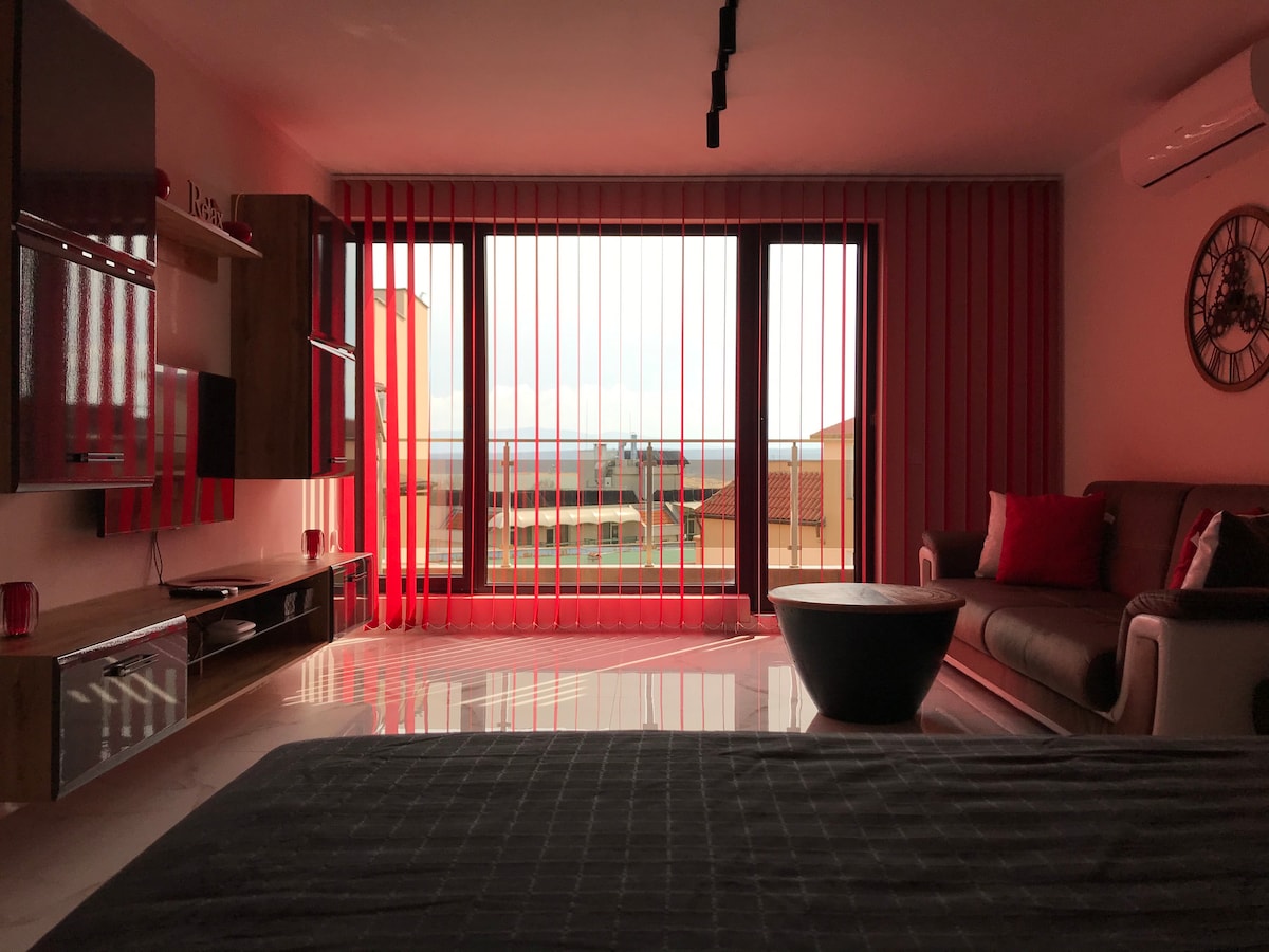 Moderan i udoban stan u centru Burgasa, samo 5 minuta (350 m) od plaže. Sadrži elegantnu spavaću sobu s blagim osvjetljenjem, udoban kauč, pametni TV, klima-uređaj i brzi Wi-Fi. Kuhinja je potpuno opremljena šporetom, mikrotalasnom rernom, frižiderom i trpezarijom. Kupatilo je svježe i funkcionalno. Stan se nalazi u blizini restorana, prodavnica i prevoza — savršen za odmor na plaži, romantični boravak ili rad na daljinu.