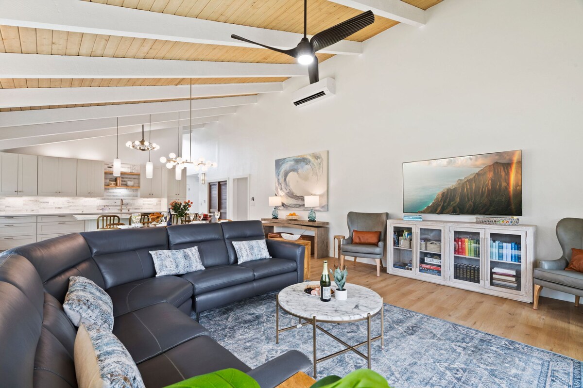 Punahele Hale, koji se nalazi u Princevilleu, je samo blok do Queen 's Bath-a. Ova kuća sa 3 spavaće sobe i 2 i po kupatila je prostrana i udobna sa nevjerovatnim ekranom na trijemu i velikim dvorištem (spoljni tuš i sve!). Ovaj smještaj je odličan za porodicu, grupu prijatelja ili čak par koji želi da provede vrijeme na Kauaiju na centralnoj lokaciji na sjevernoj obali. Klima-uređaj je u svim spavaćim sobama i dnevnoj sobi. Pogled na planinu iz dnevnog boravka i kuhinje je predivan!