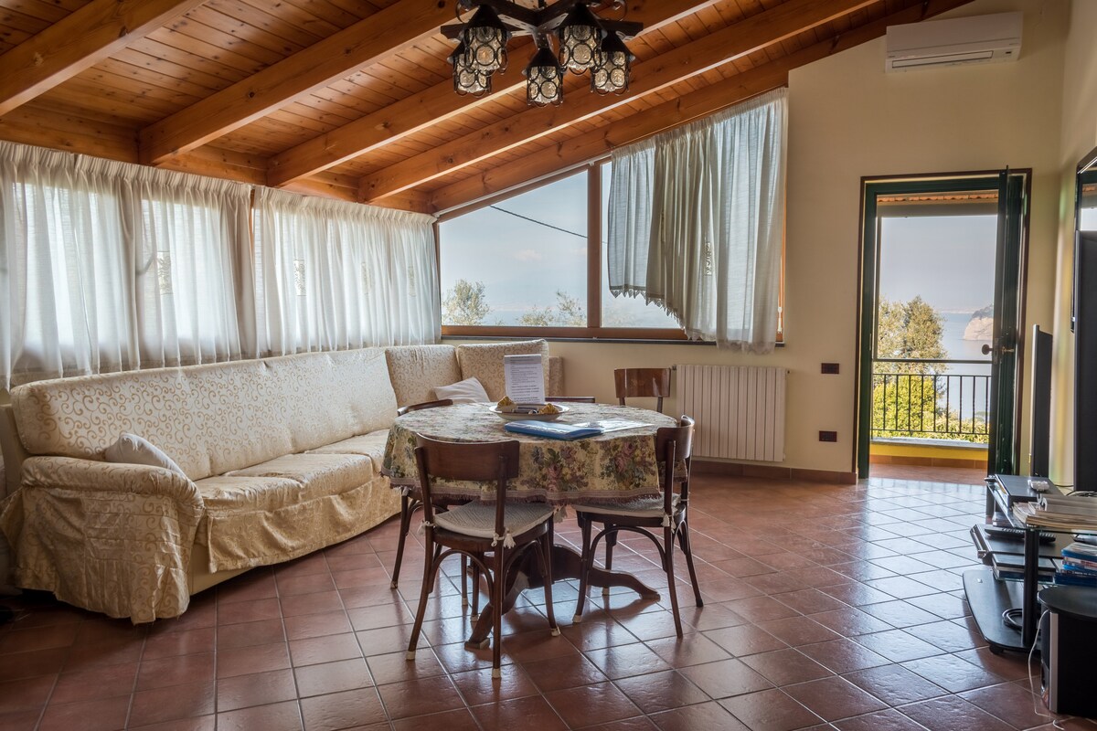 Smještena u panoramskim brdima Sorenta, ova vila, koja se nalazi na drugom spratu kuće potpuno okružene zelenilom, uživa u širokom pogledu na cijelu obalu Sorenta i Napuljski zaliv. Unutrašnjost ima veliki ulazni hodnik, dvije spavaće sobe za ukupno 5 kreveta, WC, kupatilo za goste sa kadom i kuhinju sa svim sadržajima. Stan ima veliku panoramsku terasu, ulaznu terasu i baštu sa parking mjestom.