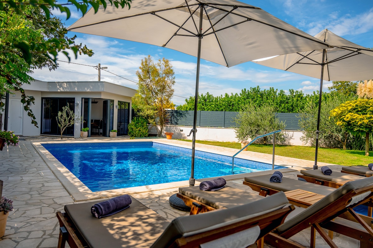 Kuća sa grejanim bazenom, dvorištem, povrtnjakom i privatnim parkingom... Kuća ima 4 sobe sa 3 bračna kreveta i 2 kreveta za decu. Sve sobe su klimatizovane i opremljene smart TV-om. 3 kupatila i veliki dnevni boravak... Kuća ima centralno grejanje i klima uređaj, bežični internet, satelitsku antenu, mašinu za veš i sudove... Spoljni kamin, spoljna terasa...